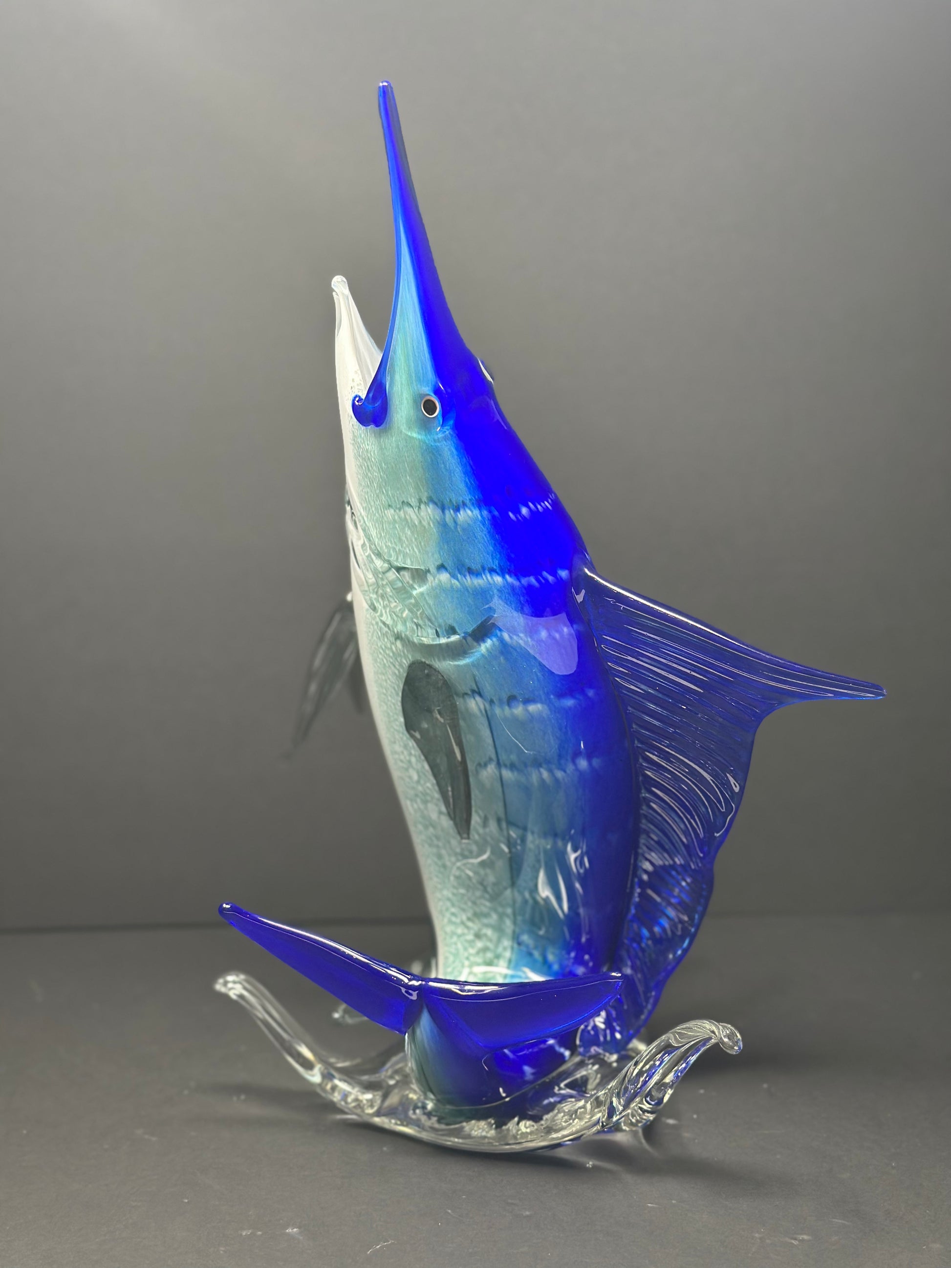 Celebrate the thrill and elegance of the ocean’s great hunter with this hand-blown glass Leaping Marlin. At 12", this sculpture captures the marlin’s powerful leap and sleek, muscular form in vibrant, flowing glass that evokes speed and grace.